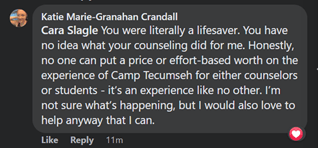 I saw your Facebook post about Camp Tecumseh and previous counselors sending a testimony about our experience. I am happy to share mine, as I look back on my time as a counselor and a camper very fondly!
