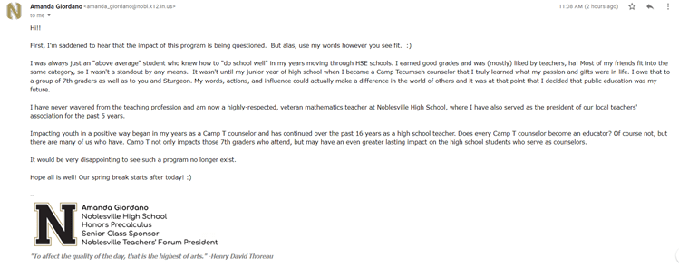Dear Ms. Donsbach, I hope this letter finds you well. I’m sure things are busy with the school year wrapping up. I was hoping to take a moment of your time to share a success. My son attends school at Fishers junior high. He is in seventh grade, and he has spent his entire life within the HSE district. Over these many years, he has received exceptional education from the teachers in our district. During the beginning of Covid, while quarantined, his teachers did everything right. They worked hard to ensure that the children were learning everything they needed, and did their best to keep them interested and engaged. Because of some personal health issues, we chose to keep him home for the entirety of his sixth grade year. He completed the year virtually without any concern for setbacks. He even learned how to play the saxophone, from the safety of our living room. Having him home during this time allowed me to get a better understanding of the curriculum and expectations that he had in the intermediate school. All of these experiences were positive, and gave me additional insight, but that is not the purpose of this letter. I’m writing to you because I want to applaud the staff at FJH and the high school students who acted as counselors over the last three days at Camp Tecumseh. I attended as well, as an adult chaperone, and cabin parent. It was incredible to witness these kids thriving in an environment that was devoid of electronics, social media, and other worldly distractions. I was able to witness them putting all of the knowledge that they had gained over the course of the year into use. They started their day at 7 AM, and didn’t end until 11 PM, and they were learning, experiencing, laughing, growing, and creating friendships with people they may have never spoken to before. I witnessed them taking water samples and examining them under the microscope, calculating the velocity at which they exited the black hole, measuring trees and determining how much lumber each tree could provide, and the total cost of that lumber, crafting balloons out of tissue paper and watching them take flight after being filled with hot air, conquering fears of heights by climbing Mt. Hood and exploring across the suspension bridge, working together with a partner to navigate a canoe across the lake, Square dancing, listening to stories, engaging in skits, and learning in an environment that was so rich with the love for teaching. There were many other things that I did not observe directly, as the kids separated off into their study groups with their high school counselors. I did, however, hear from my son about many of the lessons, experiments, and projects that they completed. Each child had a packet to work on throughout the three days. It was 49 pages in length! My son is a great student, and when I asked him about His experience at camp, this is what he said, “ I had such a great time! I am so tired, but I learned more at camp, than I ever would have in three days at school! I just wish that I had an opportunity to go back again!” He is now contemplating the possibility of becoming a high school counselor for other students at FJH when he is old enough. I would be incredibly honored for him to have that chance. Watching those high school kids teach, engage, organize, and lead their study groups made me so proud! I was in awe of their maturity and their ability to maintain a positive learning environment for those kids I spent much of my time sitting back, and watching those students teach, and it was incredible! I know it is a sacrifice for those high school students to be out of the school, but I do believe that it was an incredibly powerful, rewarding, and positive experience for them as well. Leading groups of 12/13 year old students is difficult in itself, but they were able to guide them, and teach them as well. They maintained their safety, addressed minor disciplinary issues, encouraged those who were struggling, supported those with additional needs, and provided preliminary grades to their students. These high school kids worked so very hard, and watching them gives me hope for our future! The teaching staff who organize, attend and prepare for this trip have put on an incredible opportunity for our Jr High and HS students. It truly feels like a “right of passage” and I am so very glad that they were able to experience it this year. I am looking forward to chaperoning again in a couple of years when my daughter goes through. If there was ever any question regarding the value of this trip, I hope my letter can alleviate some of those concerns. I sincerely hope that Camp Tecumseh will be something that the students at FJH will continue to experience for a very long time. I pray that you can see it’s benefit and worth and will continue to include it in the curriculum planning for years to come. Thanks for your time!