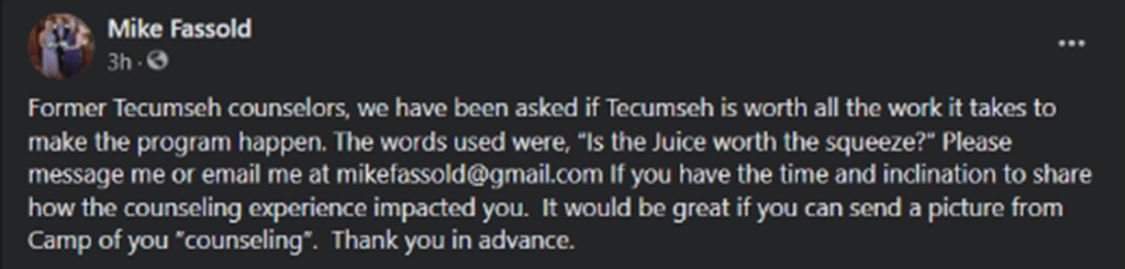 I saw your post on Facebook about Tecumseh and how that counseling experience impacted me….apparently the value and/or impact of the program is in question so here are my personal two cents!