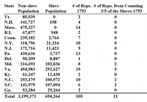 Source: Center for the Study of the American Constitution. The Impact of the Three-fifths Clause on Representation in US House of Representative, 1793.